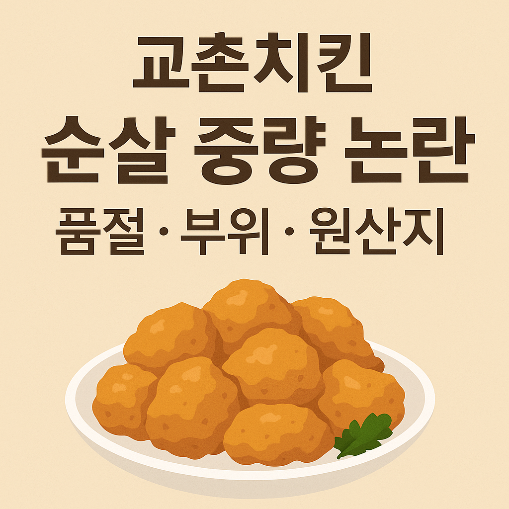 최근 교촌치킨이 순살치킨 메뉴의 중량을 줄이고, 부위와 원산지 관련 논란까지 더해지면서 소비자들의 불만이 커지고 있습니다. 일부 메뉴는 품절 소식까지 이어지며 불안감이 확산되고 있는데요. 이번 글에서는 중량 변경 사실, 부위와 원산지 논란, 소비자 반응과 대처법을 한눈에 정리해 보겠습니다.