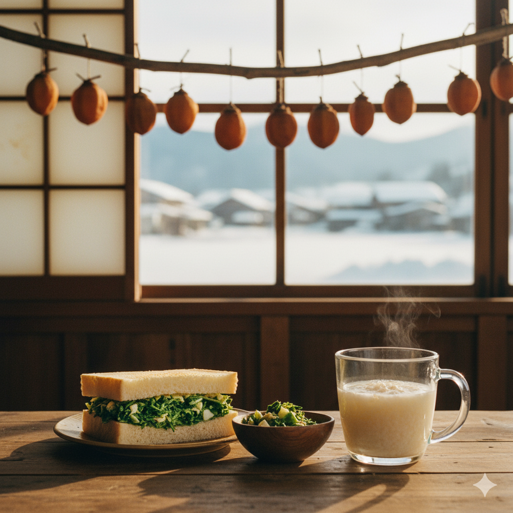 도시 생활에 지쳐 고향 코모리로 돌아온 이치코가 봄을 맞이하며 처음 만든 음식입니다. 쌉싸름하면서도 향긋한 **쑥부쟁이 나물(노칸나)**을 삶아 만든 샐러드를 듬뿍 넣은 샌드위치는, 고향에서의 새로운 시작을 상징하며 봄의 기운을 그대로 담아냅니다. 리틀 포레스트에서 이치코가 자연과의 연결을 확인하는 첫 요리입니다.