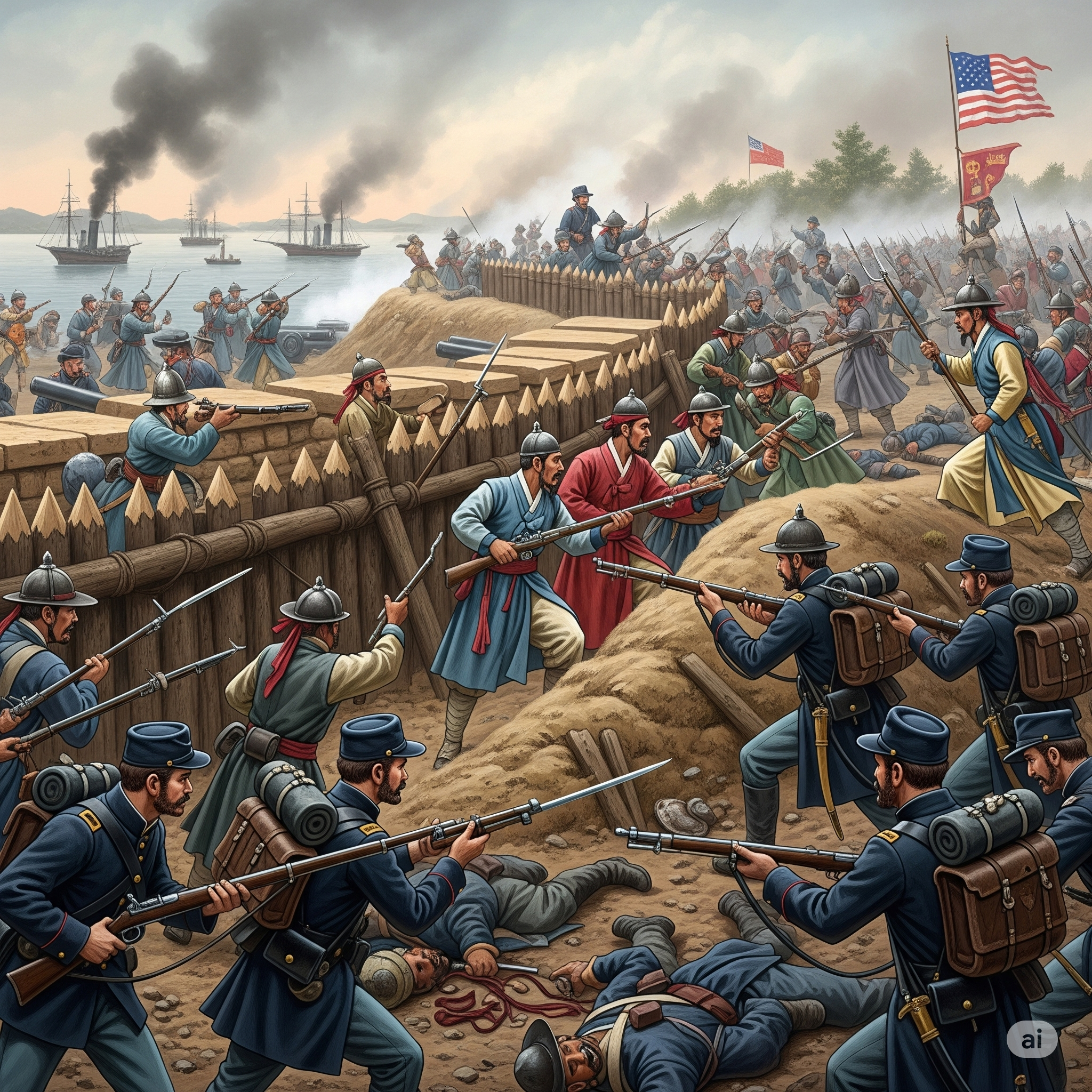 ② 광성보 전투와 어재연 장군의 항전 미국군의 다음 목표는 강화도 해안 방어의 핵심 거점인 광성보였습니다. 조선군은 어재연 장군의 지휘 아래 결사항전했습니다. 조선군은 총포 대신 활과 칼을 들고 용감하게 맞섰지만, 압도적인 화력 차이를 극복하지 못하고 전멸에 가까운 피해를 입었습니다. 어재연 장군은 이 전투에서 순국했으며, 그의 동생 어재순 또한 용감하게 싸우다 전사했습니다. 미국군은 광성보를 점령한 후 한양으로 진격하려 했으나, 조선의 강력한 저항과 더불어 강화도 진입이 쉽지 않다고 판단하여 추가적인 병력 손실을 막기 위해 철수하게 됩니다.